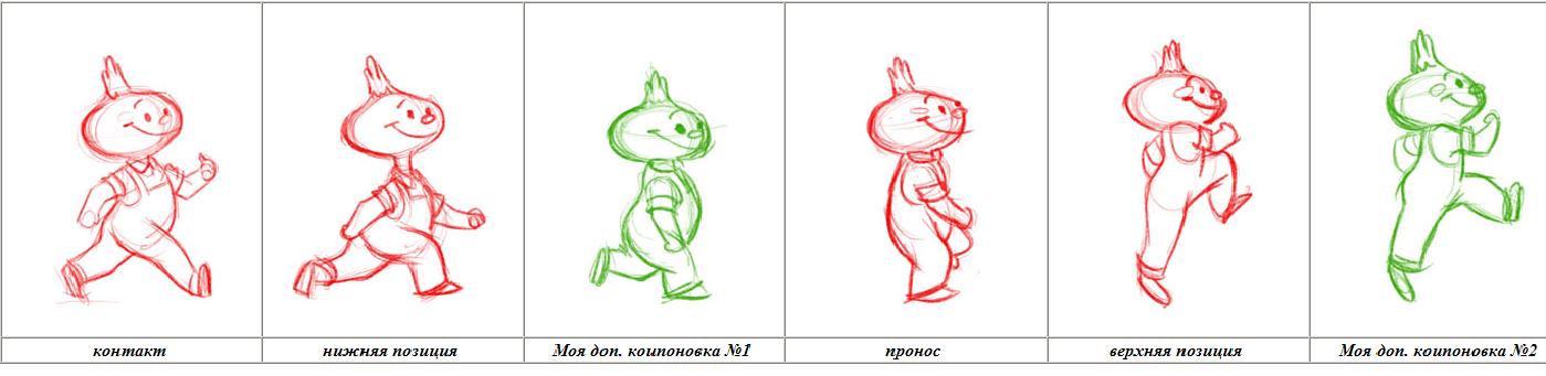 Если нарисовать все тоже самое для другой ноги, и сложить вместе, то получиться простейшая походка: Однако, тут есть одна проблема: если хочется сделать полноценную походку в 24 кадра, то придется рисовать по две фазы между компоновками, а это неудобно. Я придумал для себя такой трюк: добавляю еще две компоновки, чтобы всего компоновок стало шесть, после чего спокойно рисую фазы "по средней". Компоновки я добавляю так: одну между нижней позицией и проносом и одну между верхним положением и контактом. Мне кажется, это придает больше веса персонажу, т.е. персонаж дольше поднимается из нижнего положения, и как-бы зависает на верхней точке.